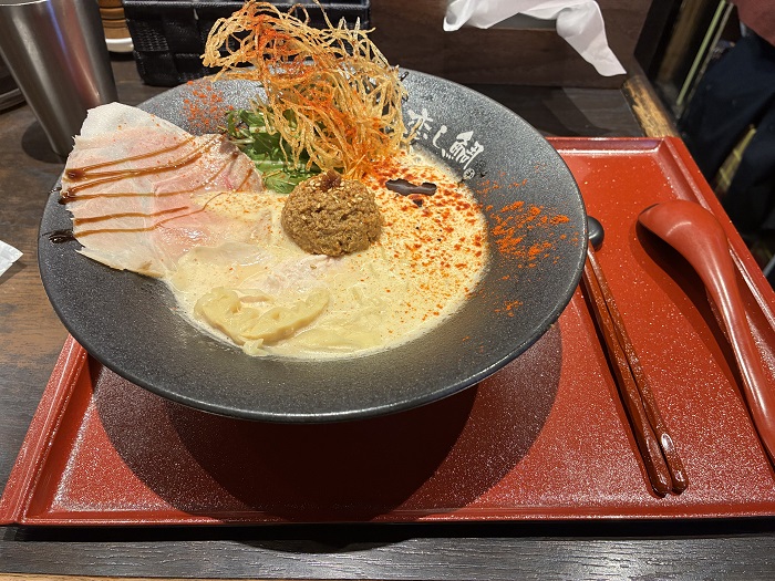 とろみのある濃厚なスープがしっかりと麺に絡みつき、すするたびに鯛の香りが鼻を抜けていきます。