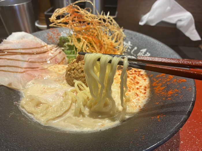 スープの強さに負けない、存在感のある麺です。